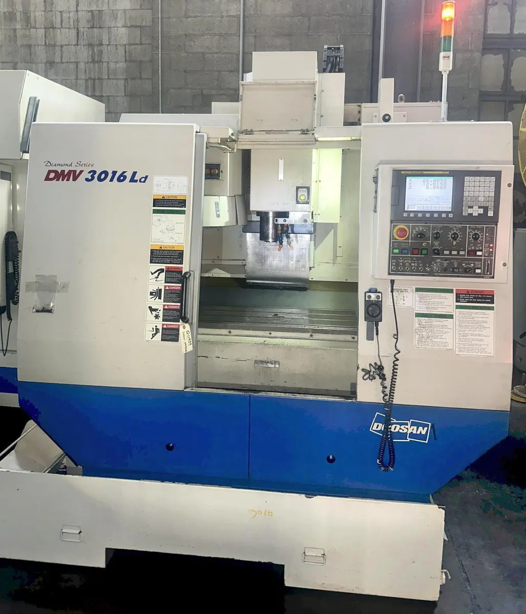 Daewoo Doosan DMV3016Ld CNC Vertical Machining Center, Fanuc Oi-MC CNC Control, 40" x 18" Table, X=30", Y=16", Z=20", CAT 40 Taper, 15 HP, 8000 Max Spindle RPM, 20 ATC, Chip Pan & Coolant System, New 2007.