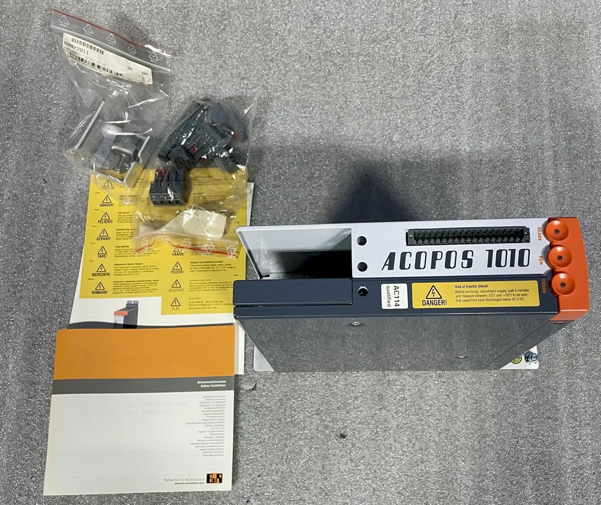 B&R ACOPOS 1010 SERVO DRIVE, Model 8V1010.00-2, 3x 400-480 VAC, 1.0 A, 0.45 kW, Integrated Line Filter, Braking Resistor and Electronic Safe Restart Interlock.