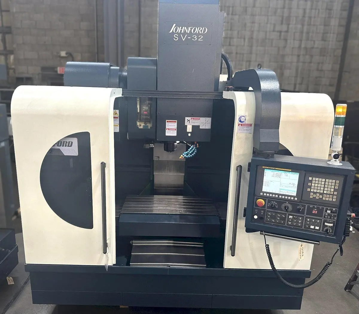 JOHNFORD SV-32 CNC VERTICAL MACHINING CENTER, Fanuc Oi-MD CNC Control, 40" x 20" Table, X=32", Y=20", Z=24", #40 Taper, 15 HP, 10000 Max Spindle RPM, 24 ATC, Chip Conveyor & Coolant System, New 2016.