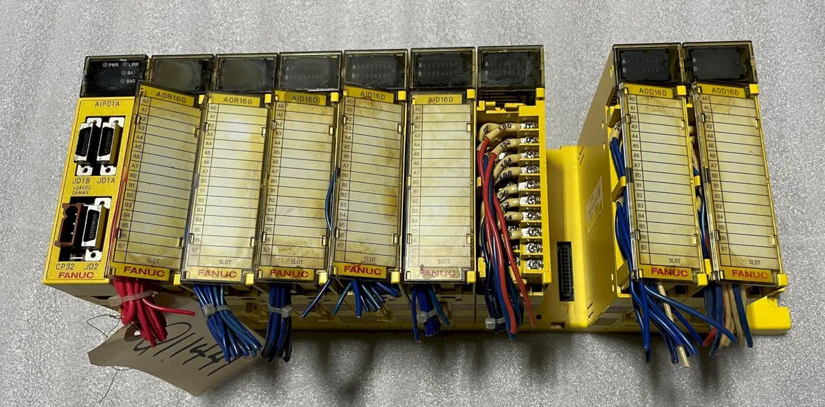 FANUC 10-SLOT I/O MODULE HORIZONTAL BASE UNIT A03B-0819-C001, (1) A03B-0819-C011 Model AIF01A Interface Module, (2) A03B-0819-C154 Model AOD16D I/O Modules, (2) A03B-0819-C161 Model AOR16G Relay Output Modules, (4) A03B-0819-C104 Model AID16D 16-Point DC Digital Output Modules.