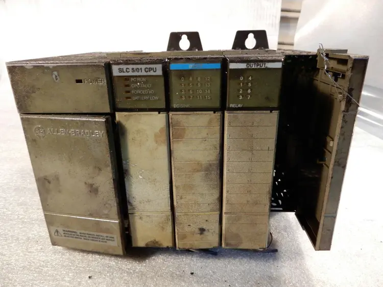 ALLEN BRADLEY RACK with SLC 500 Power Supply 1746-P1, SLC 5/01 CPU, Input Module, and Output Module.