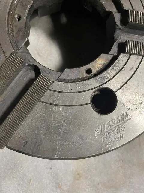 8" KITAGAWA BB208 3-JAW HYDRAULIC CHUCK, 66mm/2.6" Hole, 7.4mm/0.29" Jaw Stroke, 5000 RPM Max Speed, 99 kN Clamp Force.