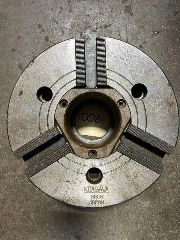 8" KITAGAWA BB08 3-JAW HYDRAULIC CHUCK, 66mm/2.6" Hole, 7.4mm/0.29" Jaw Stroke, 4600 RPM Max Speed, 87 kN Clamp Force, Lubrication Nipple on each Master Jaw.