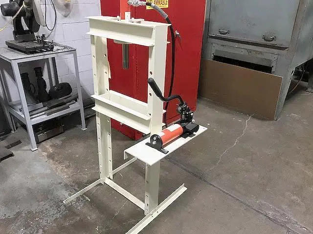 H-Frame Design, Power Team R10-6SA Hydraulic Cylinder, Power Team HF-32 Hydraulic Pump, 2-Speed Hydraulic Hand Pump, Rapid Advance and Pressing Speed, 7-1/4" x 21" Bed, Adjustable Vertical Height of Bed, Ram Adjustable Right to Left on Frame, Quality Heavy Duty Construction.