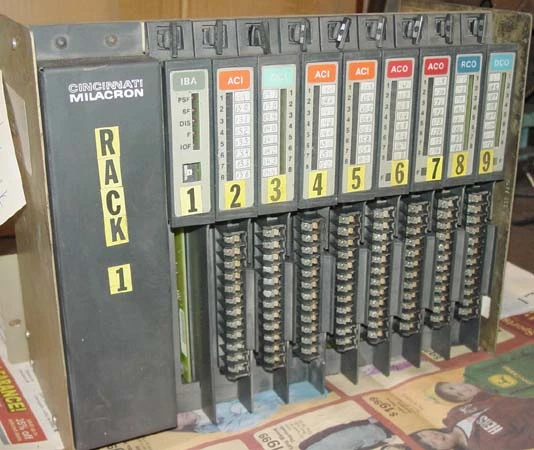 Cincinnati Milacron 850SX & 950 I/O Rack and Cards, CMI Part# 3-424-1648A, Boards (1) IBA 3-531-4267A, (3) ACI 3-531-3855A, (1) DCI 3-531-3891A, (2) ACO 3-531-3839A, (1) ROC 3-531-4262A, (1) DCO 3-531-3972A.