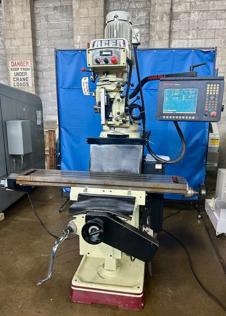 Acer EVS-3VKH-54 CNC Knee Mill, Anilam 3000 2-Axis Programmable Control with Feedback on Quill, 10" x 50" Table, X=34", Y=17", W=19", Quill Travel=5", R-8 Taper, 3 HP, 4500 Max Spindle RPM, New 2005.