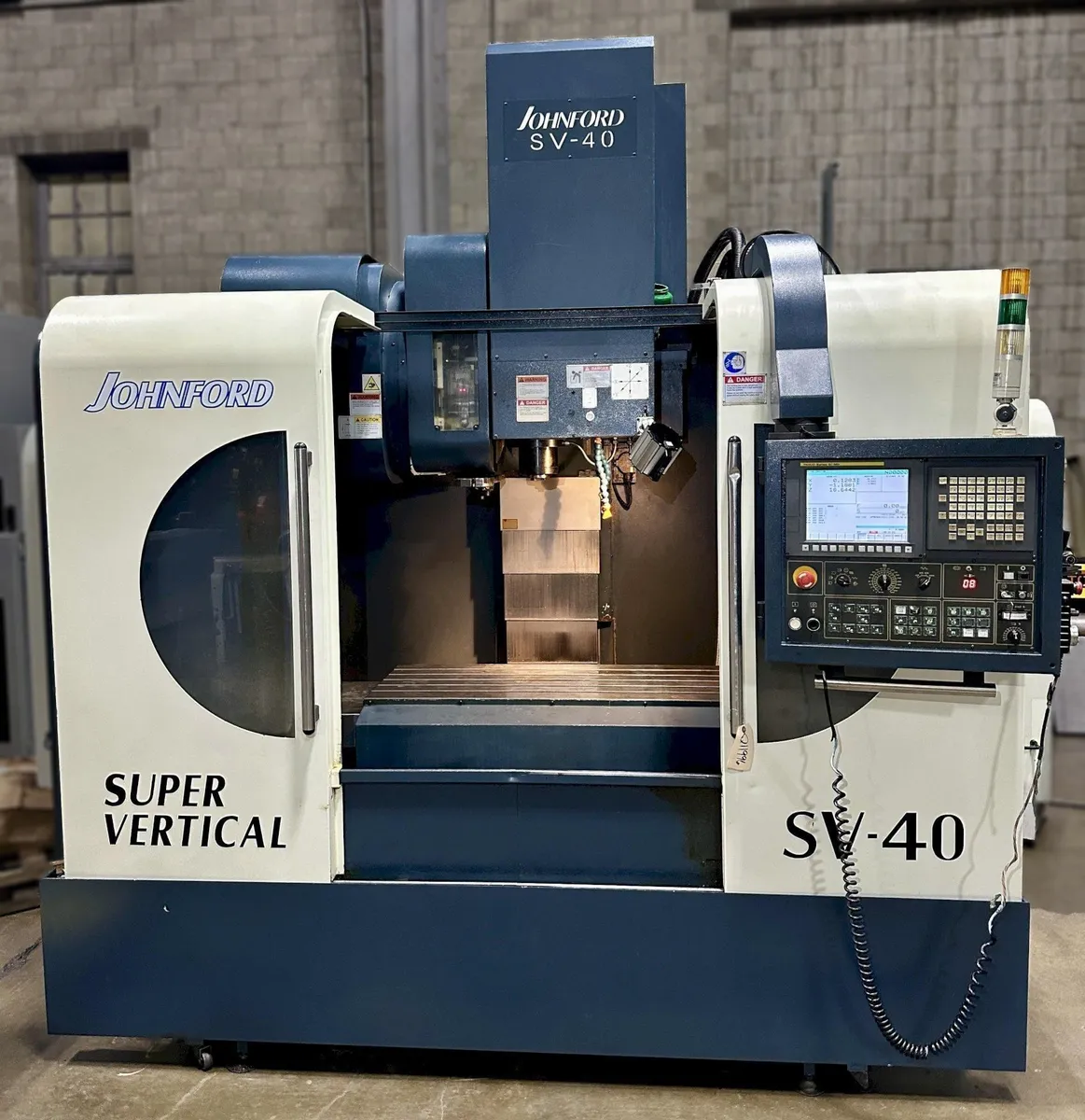 JOHNFORD SV-40 CNC VERTICAL MACHINING CENTER, Fanuc 0i CNC Control, 47" x 20" Table, X=41", Y=20", Z=24", CAT-40 Taper, 15 HP, 10000 Max Spindle RPM, 24 ATC, Chip Conveyor, New 2013.